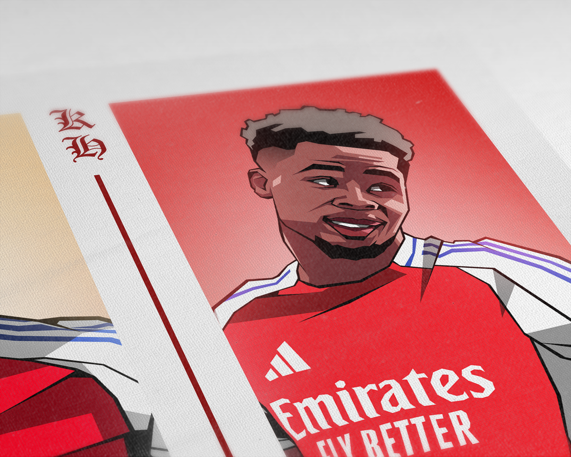 A football art print for fans of Arsenal, our art prints feature unique designs and bespoke illustrations printed on premium quality paper and shipped worldwide. This exclusive print features an art piece of Arsenal players Kai Havertz & Bukayo Saka in our 'Perpendicular' design. We pride ourselves on using the highest quality paper and printing processes to create our prints, giving you a sharp and colourful piece that can take pride of place on your wall for years to come. Frame not included.