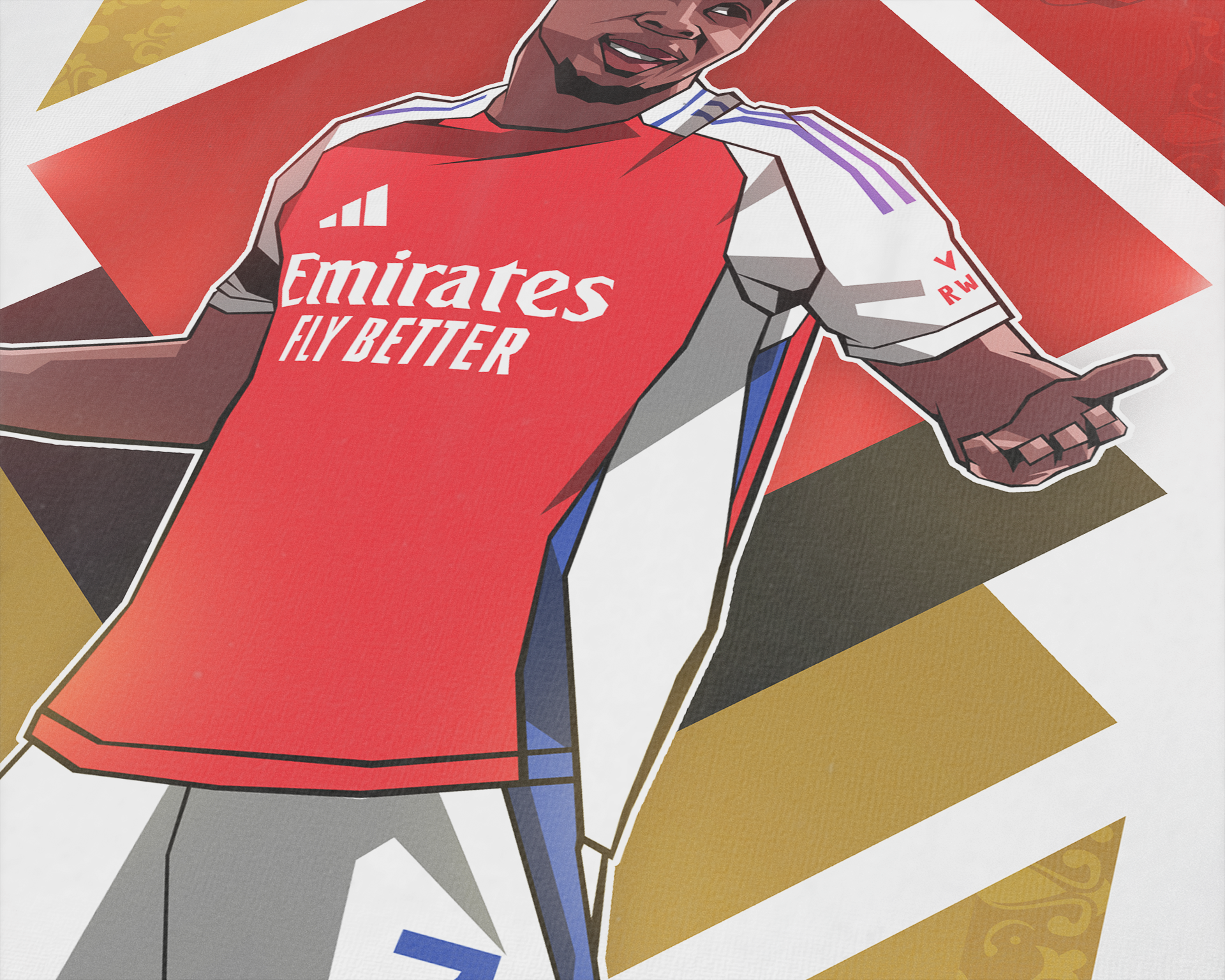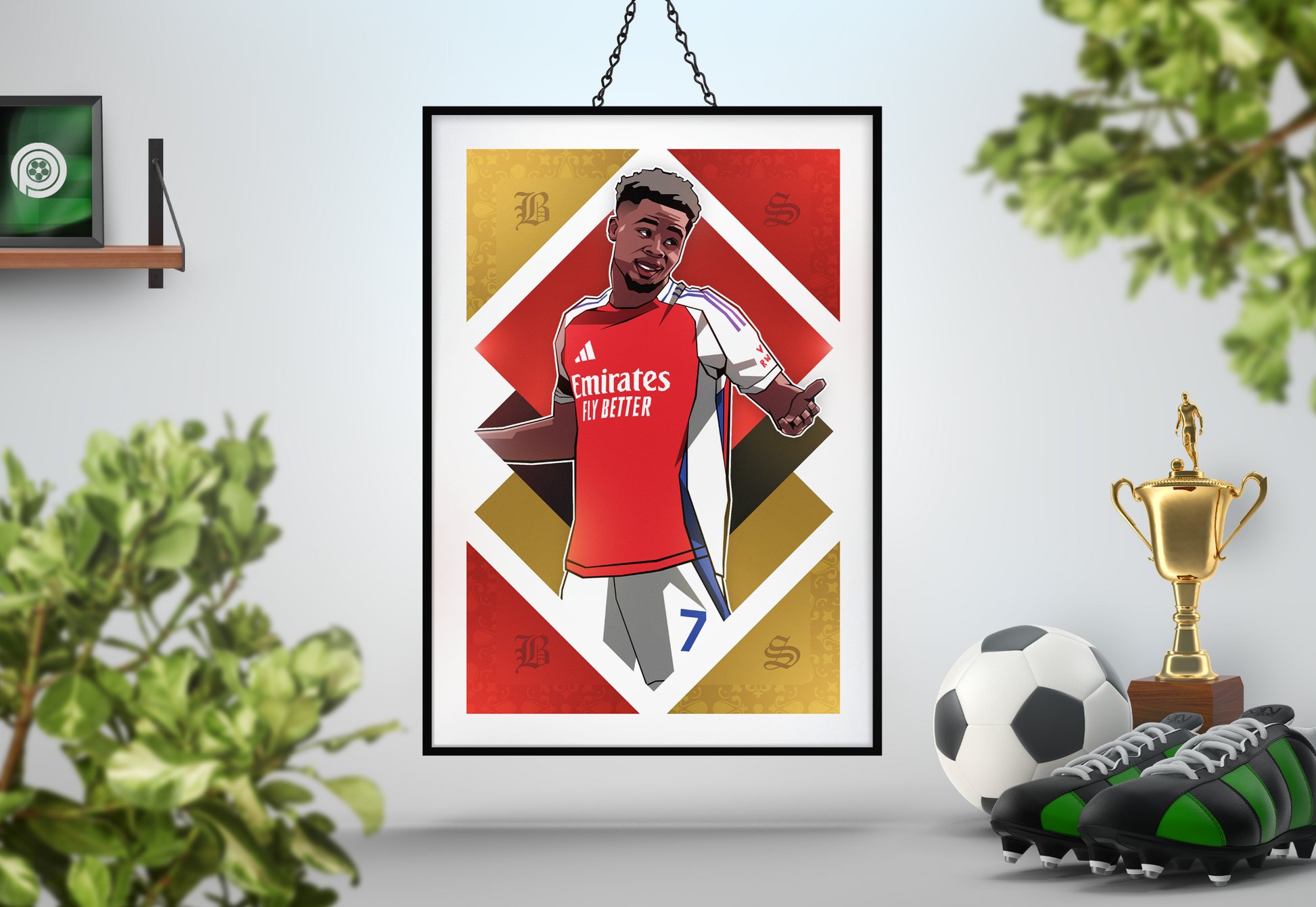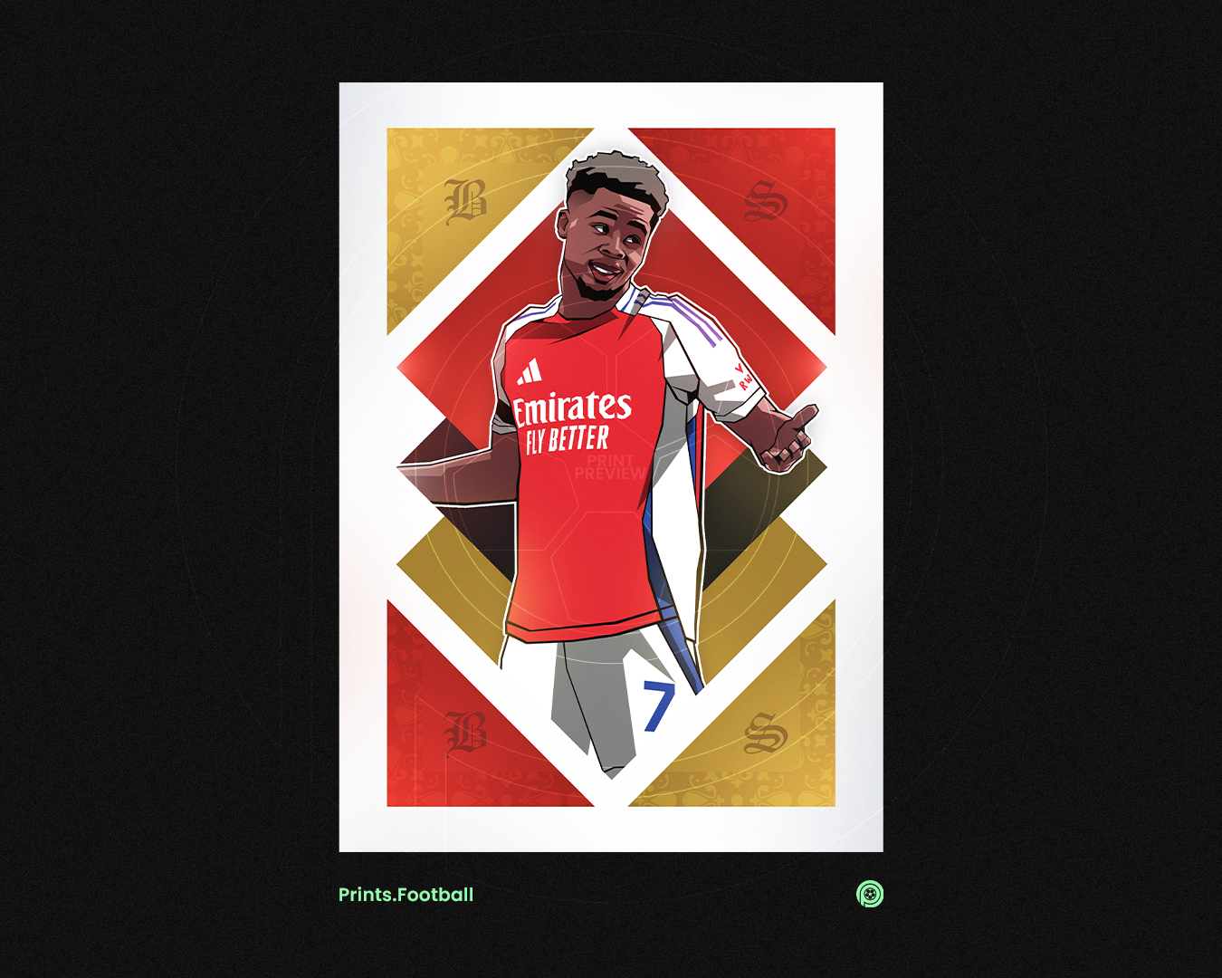 A football art print for fans of Bukayo Saka, our art prints feature unique designs and bespoke illustrations printed on premium quality paper and shipped worldwide. This exclusive print features an art piece of Bukayo Saka in our 'Diamonds' design, with the England player playing for Arsenal who currently play Premier League football. We pride ourselves on using the highest quality paper and printing processes to create our prints, giving you a sharp and colourful piece that can take pride of place on your wall for years to come. Frame not included.