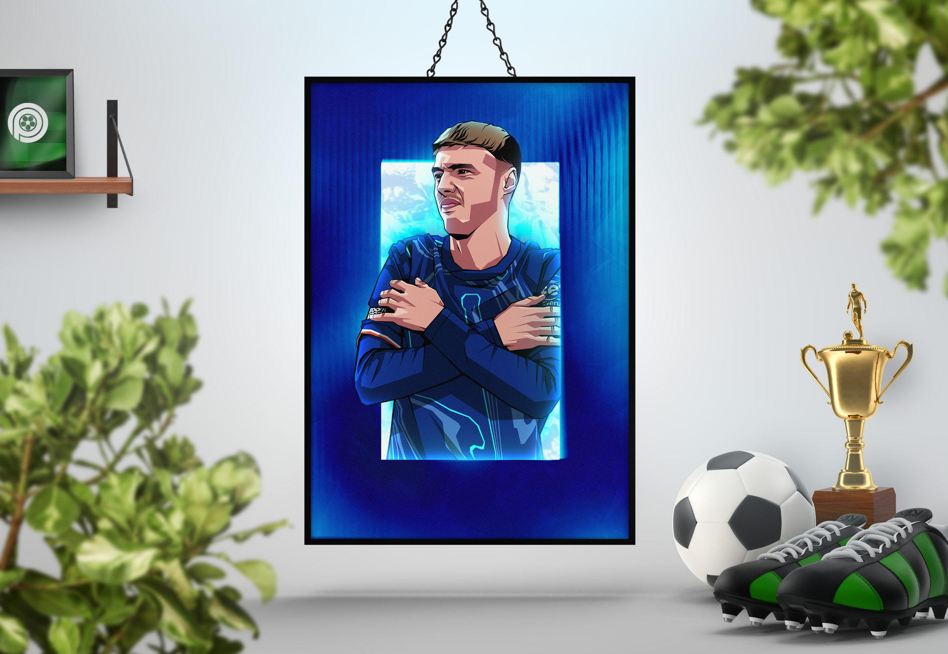 A football art print for fans of Cole Palmer, our art prints feature unique designs and bespoke illustrations printed on premium quality paper and shipped worldwide. This exclusive print features an art piece of Cole Palmer in our 'Glass' design, with the England player playing for Chelsea who currently play Premier League football. We pride ourselves on using the highest quality paper and printing processes to create our prints, giving you a sharp and colourful piece that can take pride of place on your wall for years to come. Frame not included.