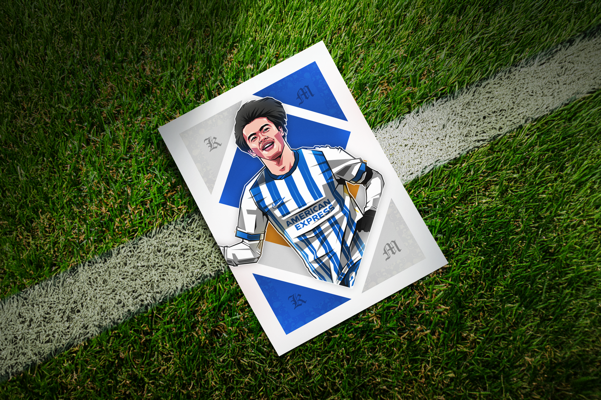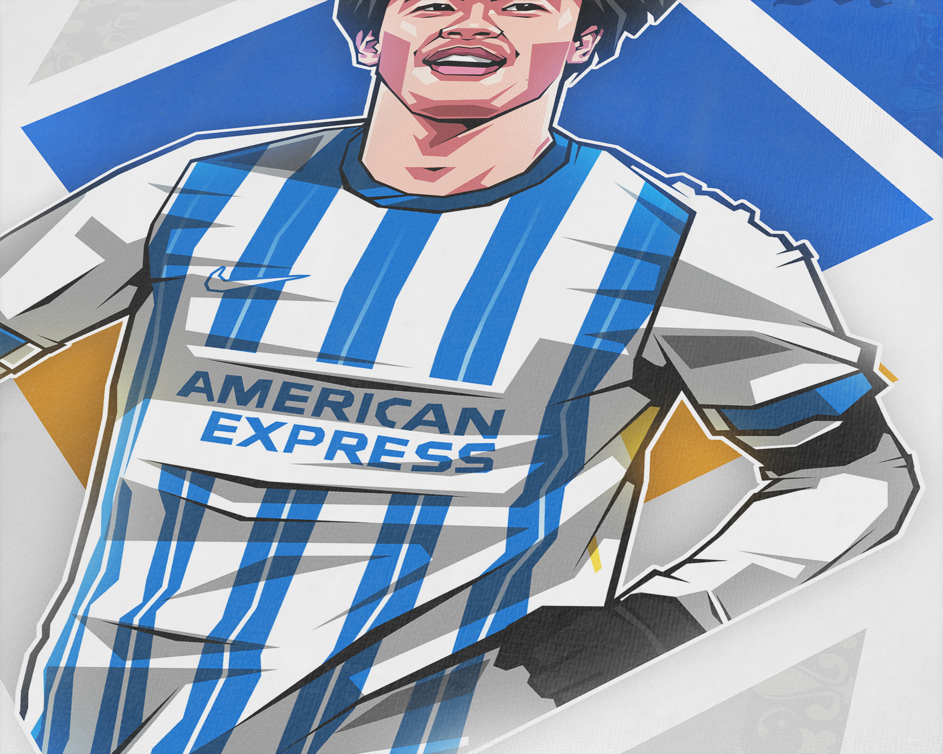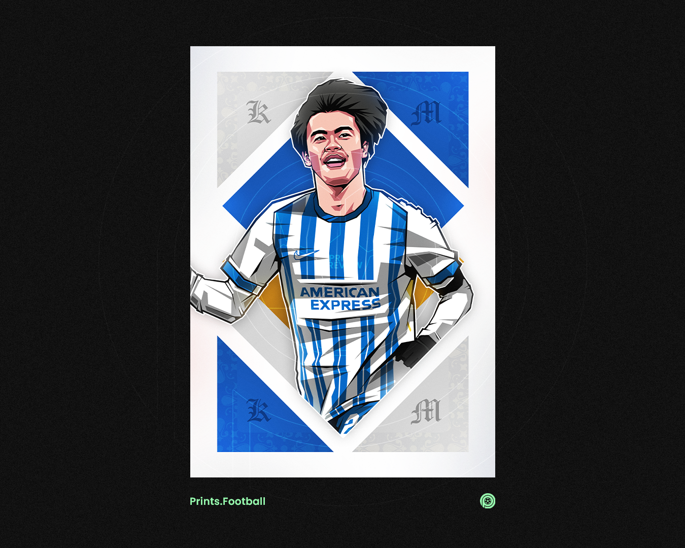 A football art print for fans of Kaoru Mitoma, our art prints feature unique designs and bespoke illustrations printed on premium quality paper and shipped worldwide. This exclusive print features an art piece of Kaoru Mitoma in our 'Diamonds' design, with the Japan player playing for Brighton & Hove Albion who currently play Premier League football. We pride ourselves on using the highest quality paper and printing processes to create our prints, giving you a sharp and colourful piece that can take pride of place on your wall for years to come. Frame not included.